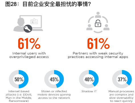 目前企业内部安全最担忧的问题包括:具有超特权访问权限的内部用户;安全措施薄弱的合作伙伴访问内部应用程序。主要的威胁来自:基于互联网的攻击(即DDoS、MITM攻击:中间人攻击、勒索攻击);被盗或受感染的移动设备进入网络;影子IT;过于缓慢的手动处置,造成更多的安全问题无法及时得到响应。