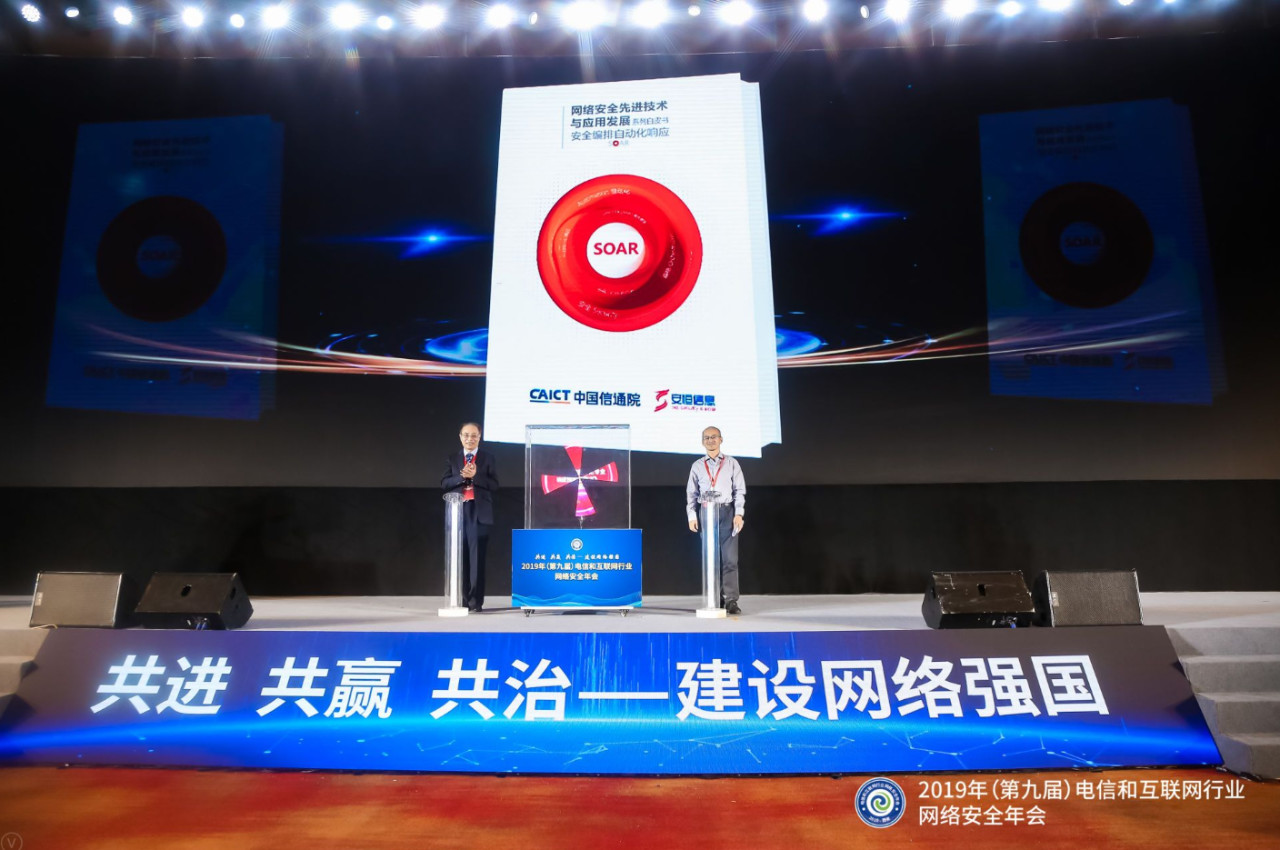 11月26日,2019年(第九届)电信和互联网行业网络安全年会在西安举行,主论坛上中国信息通信研究院安全所和尊龙凯时信息技术股份有限公司联合发布了其在网络安全先进技术领域的最新研究成果,《网络安全先进技术与应用发展系列白皮书——安全编排自动化与响应(SOAR)》(以下简称:白皮书)。