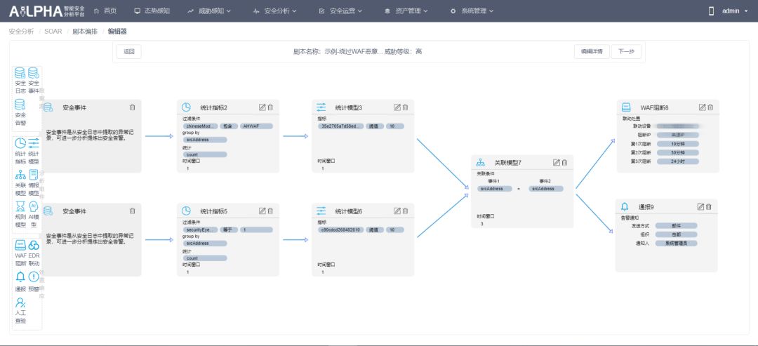 安恒AiLPHA大数据智能安全平台将人工智能与SOAR结合,在医疗、教育、金融行业已经取得很大成效。针对每一个主机建立流量行为基线,当主机被远控木马植入时,通过人工智能 RPCA-SST 算法滤除人为上网行为的噪声,检测出主机存在回连未知地址和数据泄露的特征,联合EDR发现进程存在文件篡改行为,研判分析其为变种木马,自动下发EDR文件隔离策略和防火墙流量阻断策略,及时阻断数据泄露风险。同时,调用Sherlock对木马文件追踪溯源,发现其通过钓鱼邮件植入,办公网中多个主机收到过同样邮件。继续联动漏洞扫描器和EDR对相关资产进行检测与响应。最终将该新型变种木马的文件hash、远控域名、发件邮箱加入威胁情报库,并将相关流量、日志和处置过程通过邮件通知安全管理员进一步应急分析。这一完整的对失陷终端的响应过程就是SOAR创建的剧本,体现了SOAR如何动态实现编排与自动化。