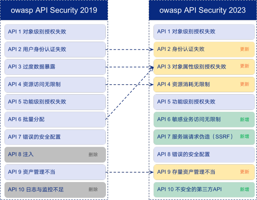 该列表与 2019 年十大 API 安全风险相比有不少变化。我们来仔细探究一下2023年与2019年相比,OWASP API Top 10所呈现出的风险变化。