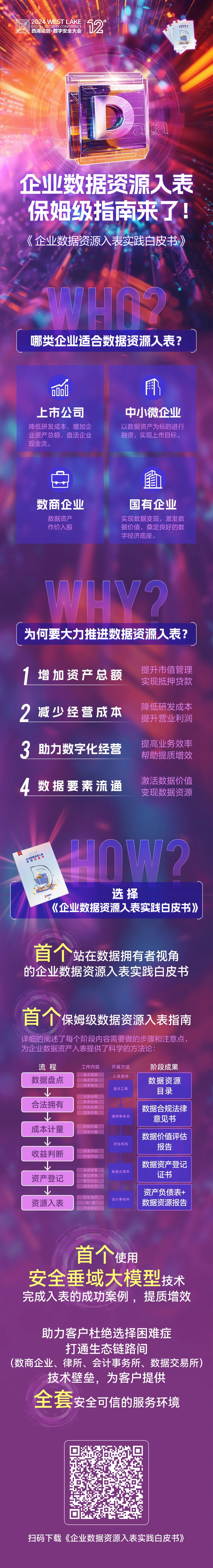 2024西湖论剑·数字安全大会期间,由杭州市财政局和杭州市数据资源管理局支持,杭州高新开发区(滨江)“中国数谷”建设工作领导小组、杭州市注册会计师协会、杭州高新技术产业开发区(滨江)财政局、“中国数谷”合规委员会指导,安恒信息、杭州数据交易所有限公司、中国软件评测中心(工业和信息化部软件与集成电路促进中心)等单位参与编制的《企业数据资源入表实践白皮书》正式发布,为企业提供了数据资源入表的实践指南,对于推动企业数据资源的合理利用和保护具有重要意义。