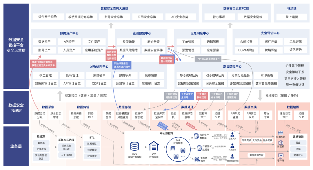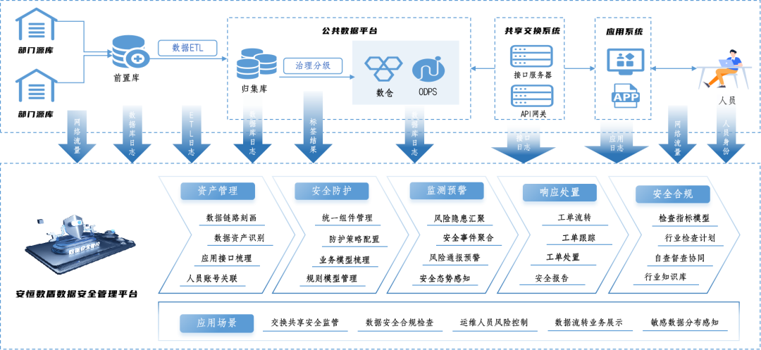 为保障“数字政务”的数据安全,解决大数据汇聚、流动及交换共享过程中产生的数据安全风险等问题,安恒信息推出了安恒数盾数据安全管理平台(又称:数据安全管控平台)。该平台利用复杂系统建模方法和大数据智能分析,提供流动数据风险治理、数据安全合规监管能力。从数据、接口、人员三个视角建立规则模型,对数据归集、处理、共享、交换场景下的数据风险进行全域治理和合规监管,对发现的数据安全风险进行及时预警和通报,建立适应数据动态流动的安全管理机制。以平台为基础工具,帮助客户建立了数据层面从资产识别、安全防护、监测预警、响应处置到安全合规的数据安全监督管理闭环。