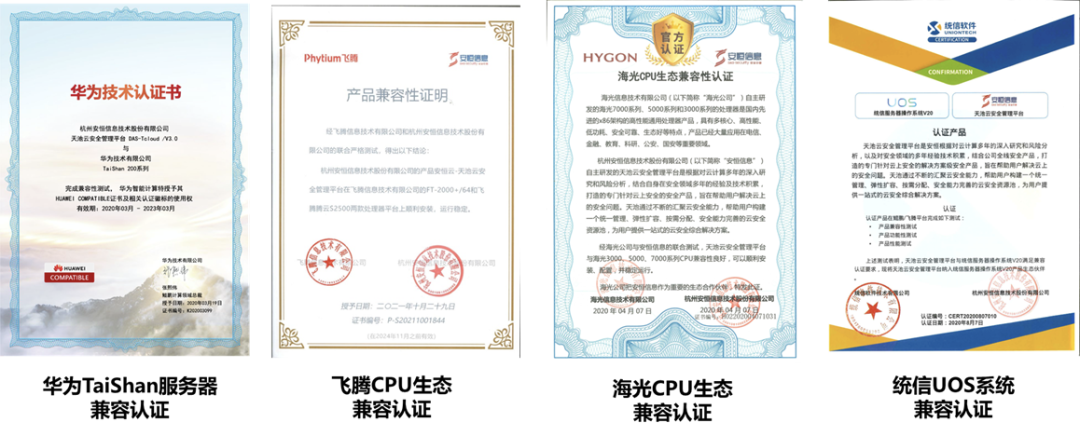 信创云安全解决方案积极响应国家信创战略,目前已完成与鲲鹏CPU、飞腾CPU、海光CPU、统信操作系统等多种信创软硬件的兼容适配,可广泛适用于各类信创云环境。