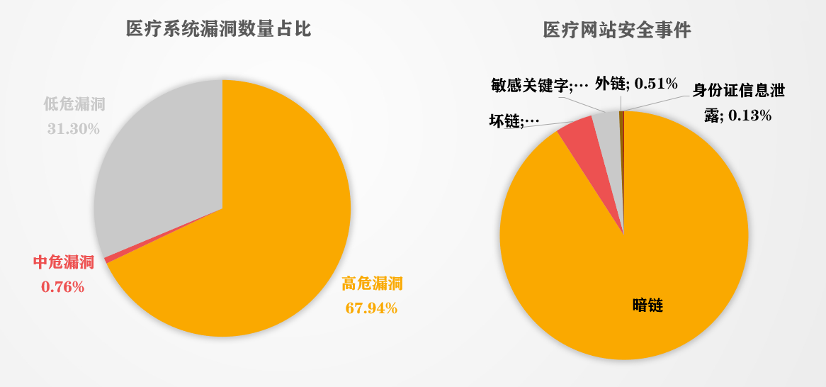 疫情期间,安恒信息风暴中心监测发现在1500余家医疗网络系统中,存在网络安全风险漏洞约750余个,其中高危漏洞占比最高,约67.94%;其次是低危漏洞,占比约31.30%;中危漏洞占比约0.76%。
