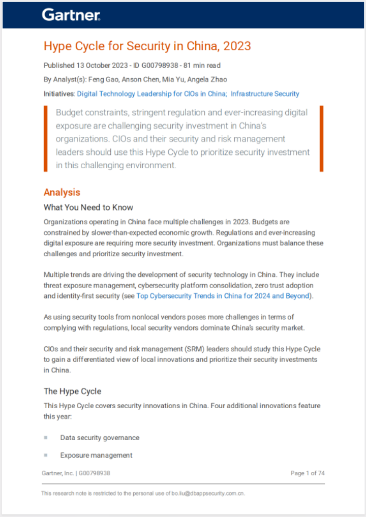 国际权威IT研究咨询机构Gartner发布《Hype Cycle for Data, Analytics and AI in China, 2023》报告。安恒信息作为数据安全领域的领军企业之一,致力于数据分类分级,连续两年被Gartner报告列为“数据分类分级领域”领跑厂商。